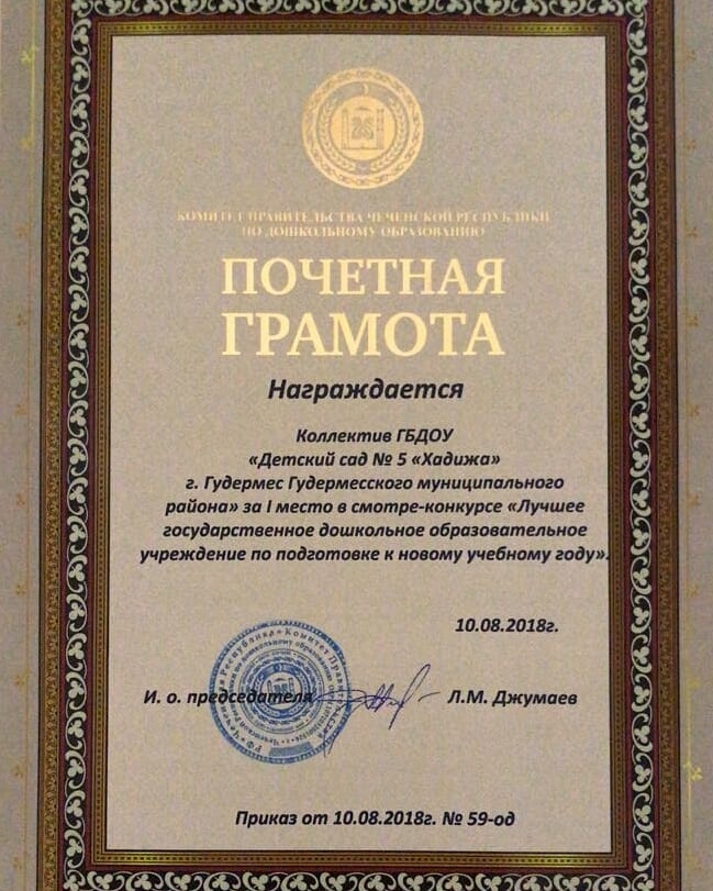 31.08.2018Коллектив ГБДОУ "Детский сад № 5 "Хадижа", награжден почетной грамотой, за первое место в смотре - конкурсе "Лучшее государственное дошкольное образовательное учреждение по подготовке к новому учебному году".